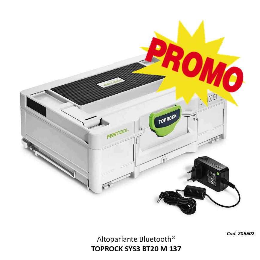 Il nuovo membro della band nella famiglia del sound Festool si chiama TOPROCK. L’altoparlante Bluetooth®, integrato nel coperchio Systainer³, abbina tutti i vantaggi del sistema Systainer Festool ad un audio di prim’ordine. Quattro altoparlanti ad alta potenza, unitamente all’accurata concezione della camera di risonanza, garantiscono un sound chiaro ed avvolgente. Desiderate ancora di più? Allora, connettete semplicemente due TOPROCK al vostro smartphone: sperimenterete un sound stereo avvolgente.