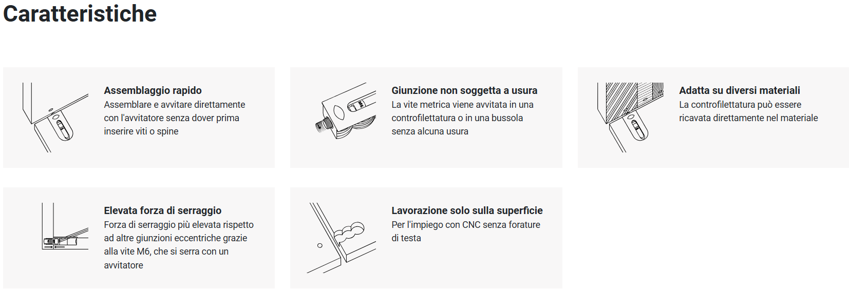 Cabineo 8 M6 è una giunzione per armadi a pezzo unico basata su foratura o fresatura, per la quale è necessario lavorare solo la superficie. Non sono necessari i fori sui bordi per un tassello. Grazie a questa caratteristica, la lavorazione è possibile su tutti i centri di lavoro CNC, comprese le semplici macchine a 3 assi e le macchine di nesting. Cabineo a pezzo unico viene pressata nel foro o nella fresatura in officina o dopo il trasporto in cantiere. Durante l'assemblaggio, la vite sporgente premontata si posiziona nel foro opposto. Con un avvitatore elettrico e la punta Cabineo, la vite viene avvitata nella controparte e i pezzi vengono collegati in modo rapido e sicuro. A differenza di Cabineo 12, l'alloggiamento di Cabineo 8 M6 è dotato di una vite metrica con filettatura M6 al posto di una vite per legno. La giunzione CNC è ideale per la giunzione di materiali in legno con materiali come alluminio, acciaio o HPL. È adatta anche per mobili di alta qualità progettati per essere rimontati più volte senza usura. La vite metrica della giunzione per mobili si ancora direttamente in una filettatura ricavata nel materiale. Un'applicazione tipica è uno scaffale aperto con telaio in metallo e ripiani in legno. Laddove la filettatura non può essere ricavata direttamente nel pezzo, una bussola filettata Cabineo inserita nel materiale è una buona alternativa. Se una bussola filettata continua Cabineo viene montata in un pannello centrale, è possibile fissarvi ripiani su entrambi i lati con Cabineo 8 M6 integrato. Ciò consente un'elevata forza di serraggio, una maggiore robustezza e un montaggio e smontaggio ripetuti e senza usura dei mobili. Rispetto alla giunzione a eccentrico, Cabineo convince per una lavorazione più efficiente e un montaggio più rapido e inoltre, si distingue per l'elevata forza di serraggio e questo senza l'impiego di tasselli in legno aggiuntivi. Cabineo offre notevoli vantaggi nel processo di produzione, trasporto e processo di montaggio. In questo modo la giunzione può essere montata nei pezzi già durante il processo di produzione in modo che non vada persa. I pezzi possono a loro volta essere impilati come flatpack per il trasporto. E tutto questo senza parti sporgenti che potrebbero danneggiare i pezzi. Vengono eliminati anche l'imballaggio e i costi logistici aggiuntivi per un sacchetto di ferramenta separato. Durante l'assemblaggio finale non è necessario montare parti di ferramenta sfuse. A seconda del colore del materiale utilizzato, il colore dell'alloggiamento più adatto è il bianco o il nero. Se Cabineo deve essere nascosta, i copriforo sono disponibili in colori diversi.