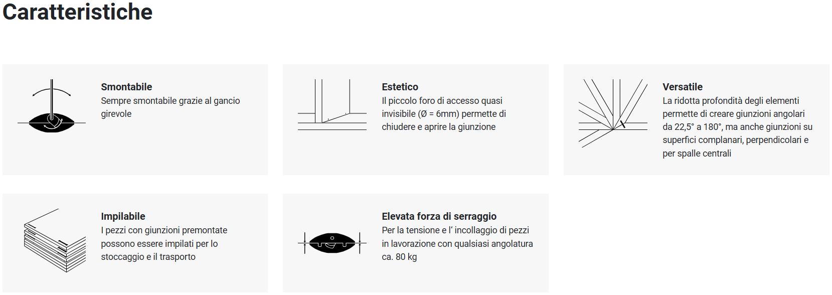 - Giunzioni angolari di pannelli con spessore a partire da 18 mm