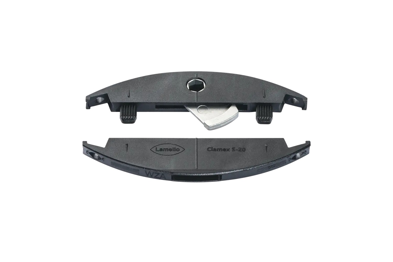 Clamex S-20 è una giunzione smontabile per il sistema Lamello per pannelli con spessore a partire da 16 mm e viene fissata con viti nella fresata. Con il foro di accesso minimo di 6 mm, Clamex S-18 si collega e si scollega come una giunzione a eccentrico tramite una leva. Grazie al piccolo foro di accesso di soli 6 mm di diametro, Clamex S-20 si distingue per l'estetica perfetta e consente giunzioni quasi completamente nascoste. Non richiede colla, consente di realizzare giunzioni estetiche in tutti gli angoli ed è ideale per giunzioni fisse o smontabili. Le dimensioni di Clamex S-20 sono identiche a quelle della lamella in legno originale da 20 e anche lo spessore della giunzione è di 4 mm. In questo modo, le fresate da 4 mm, proprio come la lamella in legno, possono essere eseguite con qualsiasi fresatrice e praticamente con qualsiasi angolo. Per il foro di accesso, in ogni confezione è inclusa una dima di foratura che consente di praticare il foro con tutti gli angoli da 22,5° a 180°. Le giunzioni sottili vengono quindi inserite nei pezzi e fissate con due viti Clamex S-20 appositamente realizzate. Infine, i due pezzi vengono collegati con una chiave esagonale. In questo modo si eliminano completamente i tempi di attesa per l'asciugatura della colla e un pezzo assemblato può essere immediatamente predisposto per la lavorazione o la spedizione. Anche se è disponibile una Zeta P2 per la fresatura di giunzioni P-System, può essere utile portare in cantiere una fresa a scanalare standard al posto della Zeta P2. Un pezzo che deve essere adattato in loco può essere lavorato con una Classic X e montato con Clamex S-20, anche se il resto del mobile è stato realizzato in officina con Clamex P-14. Visivamente questo non si nota, poiché le dimensioni del foro sono identiche.