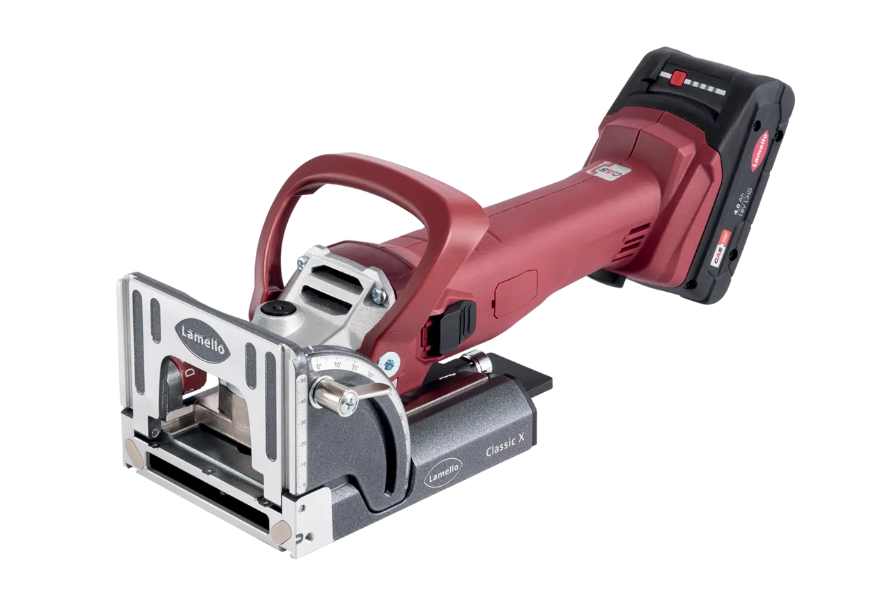 Classic X a batteria è la fresatrice senza fili dell'inventore del sistema Lamello che realizza una fresata precisa di 4 mm per le giunzioni in legno. La collaudata e sofisticata fresa a scanalare può essere utilizzata in modo rapido e versatile e costituisce la base per l'ampia gamma di giunzioni fisse, autobloccanti e smontabili. La Classic X a batteria si contraddistingue per i suoi componenti in alluminio lavorati con precisione. Le superfici di battuta fresate sulla piastra di base, sul ribaltino e sulla battuta angolare consentono un appoggio preciso sul pezzo. La precisa interazione tra le parti mobili durante la fresatura crea fresate precise e parallele per una perfetta precisione d'incastro dei pezzi. Il punto forte della fresa a scanalare di Lamello è tuttavia la battuta angolare multifunzionale. Viene spinta sulla piastra di base per garantire una movimentazione sicura della macchina durante la fresatura della superficie. Si utilizza anche per regolare con precisione la posizione della scanalatura da 0 a 50 mm o per realizzare angolari ancora più precisi grazie al posizionamento sulla superficie esterna del mobile. I vantaggi della Classic X a batteria rispetto alla fresatrice per tasselli piatti alimentata a rete elettrica risiedono nel breve tempo di configurazione e nella maggiore mobilità in officina e in cantiere. La macchina è riposta a portata di mano nella valigetta ed è subito pronta all'uso, senza dover collegare prese, rotoli di cavi o apparecchi di aspirazione. I pezzi più grandi in officina possono essere lavorati da tutti i lati senza la necessità di dover tenere i cavi o il rischio di inciampare. La fresa a scanalare a batteria, che funziona con le potenti batterie da 4,0 Ah della gamma CAS, è straordinaria anche in cantiere. Lavorare senza alimentazione elettrica o senza portare con sé dispositivi di aspirazione semplifica il lavoro.