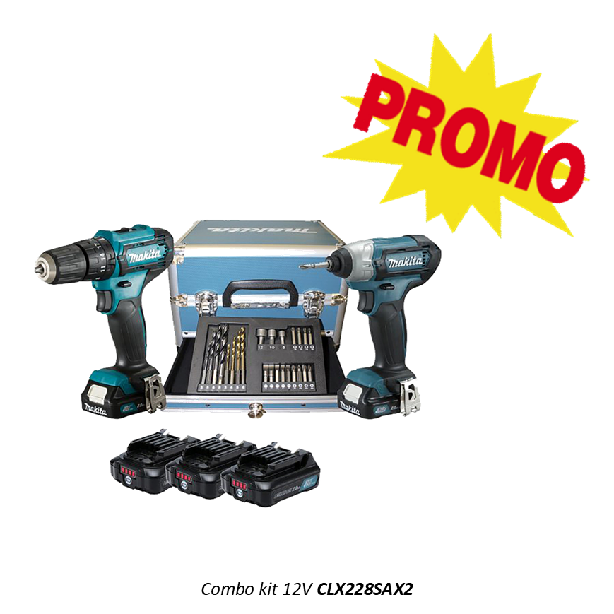 Include: HP333D - Trapano avvitatore a percussione 12Vmax + TD110D - Avvitatore a impulsi 12Vmax. Fornito con tre batterie CXT® 12Vmax 2,0 Ah, caricabatterie e un set di inserti per avvitatura.
