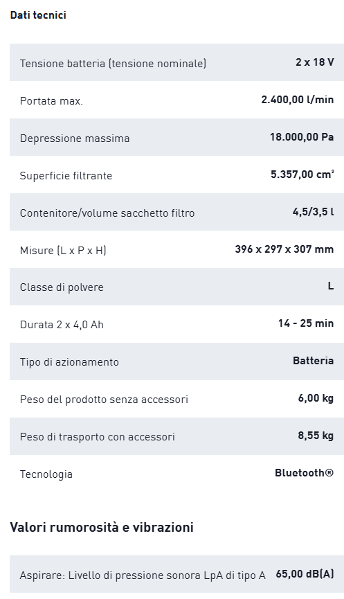 - funzione Bluetooth® per accensione a distanza dell'aspiratore con utensili a batteria