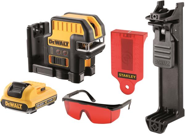 Tracciatore laser con raggio rosso, classe 2. Proietta: 2 linee a croce orizzontale e verticale + 2 punti a piombo. Autolivellante +/- 4°. Precisione +/- 3mm a 10 metri. Raggio di utilizzo 30 metri per i punti e 20 metri per le linee, con il ricevitore 50 metri. Attacco femmina 1/4"+5/8". Base di supporto integrata, pivottante e magnetica. Blocco del pendolo. IP 65. DOTAZIONE: 1 batteria XR 10.8V 2.0Ah, caricabatterie, supporto da parete, target, occhiali, valigetta TSTAK.