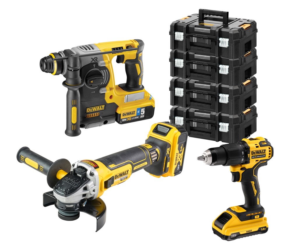 KIT DCH273 tassellatore SDS-Plus 2.1J + DCG405 smerigliatrice 125mm + DCD709L2 trapano a percussione + 2 x 18V 3Ah + 1 x 18V 5Ah + 4 x TSTAK