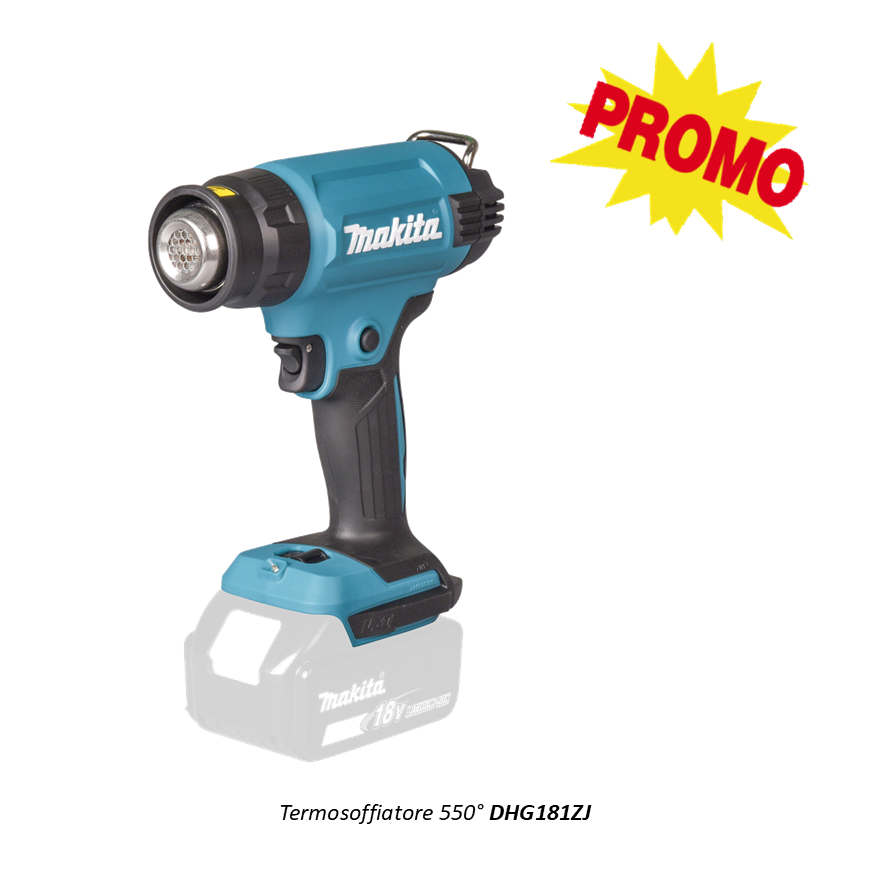 DHG181 offre un'autonomia fino a 23 minuti continui con una batteria da 6,0 Ah. Struttura compatta e leggera, impugnatura morbida rivestita in gomma per il massimo comfort, illuminazione dell’area di lavoro con luce a LED. Comodo interruttore a grilletto con funzioni di blocco, sistema di sgancio rapido degli ugelli per evitare scottature accidentali.