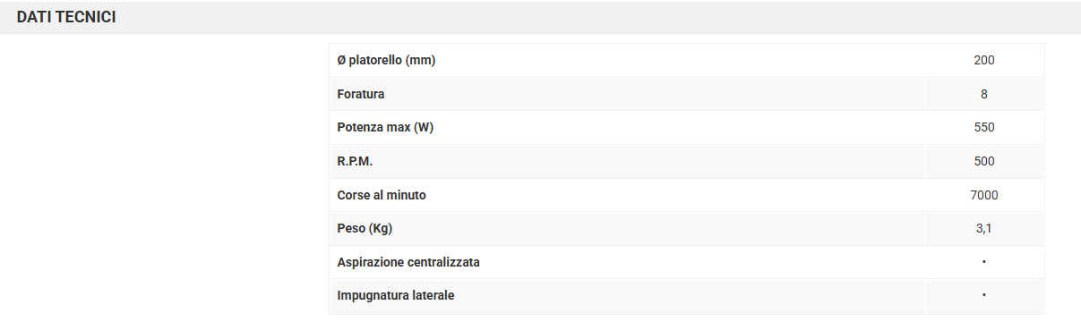 Il movimento a rotazione forzata ad ingranaggi consente la massima capacità di asportazione per un notevole risparmio di tempo ed energieOttima capacità di aspirazione delle polveri prodotteParti elettriche isolate con resine speciali per una maggior protezione e durata dell’utensilePredisposte per la connessione a sistemi di aspirazioneRegolatore di depressione che elimina l’effetto “ventosa” del platorello sulla superficieImpugnatura laterale montabile sia a destra che a sinistra