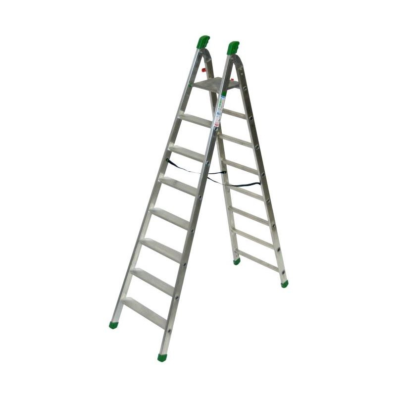 STRUMENTA in alluminio è scala a doppia salita. Davanti: gradini larghi profondi 85 mm energicamente bloccati ai montanti con doppio passaggio idraulico e riposante inclinazione di 68°.Dietro: pioli quadri 30x30 mm con inclinazione di lavoro più verticale 75° per meglio avvicinarsi alle pareti e rendere rigida la scala.Progettata per specifico uso professionale intensivo è dotata di particolari tecnici esclusivi quali la cerniera e la pedana in alluminio fuso.