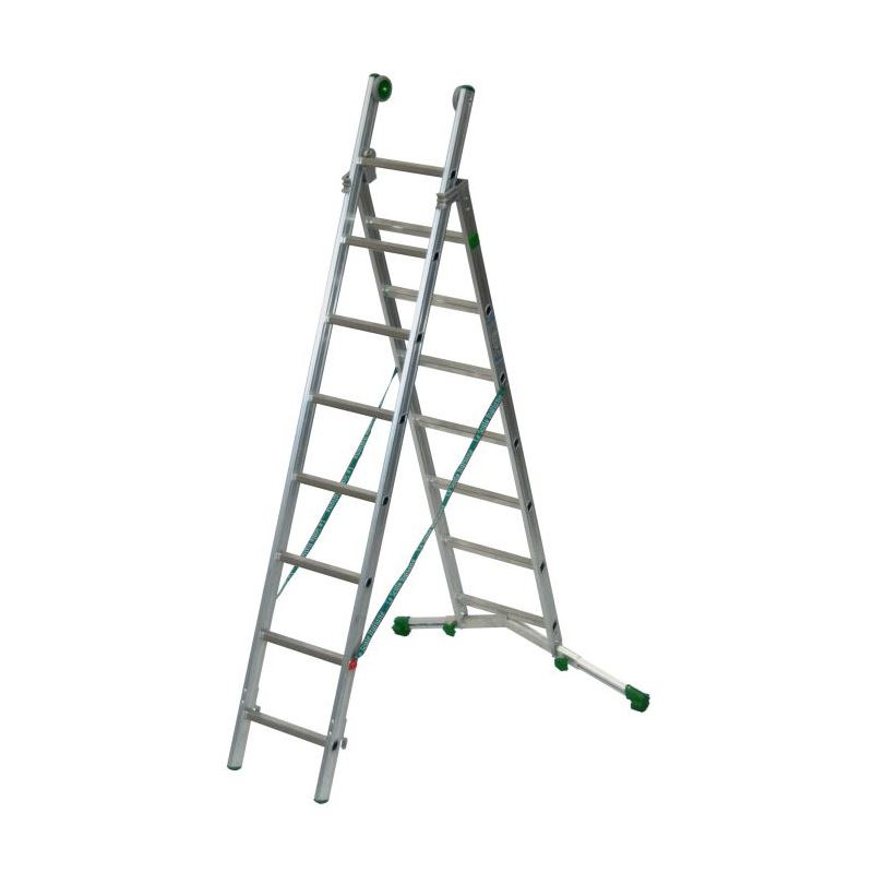 PRIMA trasformabile è scala professionale in alluminio a due oppure tre rampe di elevato livello tecnico idonea per uso intensivo. Ampi montanti riducono al minimo le flessioni ed i pioli 30x30 mm a sezione romboidale inclinati di 68° garantiscono l’appoggio dei piedi in piano, quindi il non affaticamento delle gambe (brevetto).La barra stabilizzatrice telescopica saldata è sempre sollevata da terra, regolabile al terreno ed esprime massima tecnologia.La barra telescopica è integrata alla scala, mai da montare a parte.PRIMA è un progetto mirato ad offrire al mercato un prodotto superiore ad ogni paragone.È scala capace di porsi sempre in condizioni di perfetta stabilità e di adattarsi ad ogni situazione ambientale anche la più sfavorevole quali pendenze, falsipiani o dossi.Le cerniere d’alluminio fuso permettono l’apertura anche a cavalletto in posizione di “zoppo”.