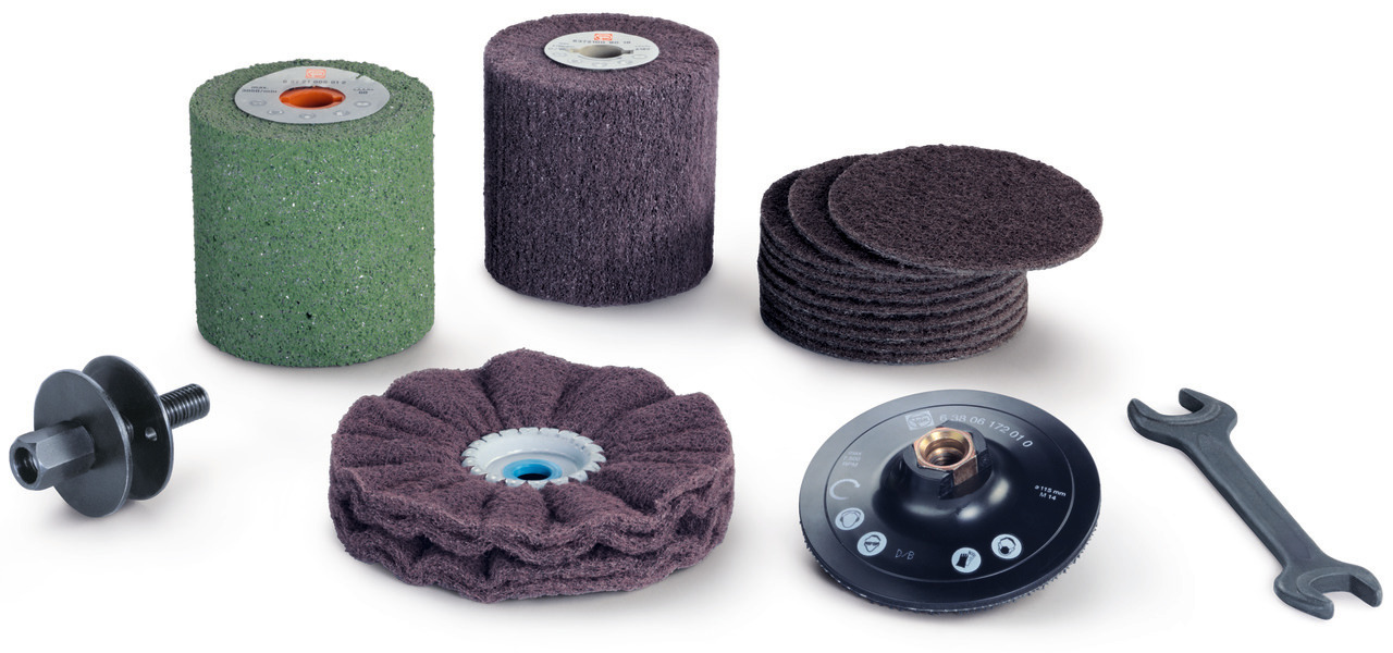 Set per applicazioni standard nella lavorazione delle superfici: dall'eliminazione di sporcizia con il feltro ondulato alla rimozione del nero della saldatura fino a una satinatura di buona qualità. Composto da: 1 rullo di satinatura elastico, grana 60 (6 37 21 006 01 2) 1 rullo in tessuto vlies (6 37 21 009 01 8) 1 disco abrasivo in vlies ondulato (6 37 23 021 01 3) 10 dischi di satinatura in tessuto vlies a grana fine (6 37 32 003 01 5)1 platorello (6 38 06 172 01 0) 1 albero di fissaggio (6 38 03 066 02 4) 1 chiave a piolini (6 29 10 022 00 2) 1 chiave doppia 19 x 22 (6 29 04 003 00 0)