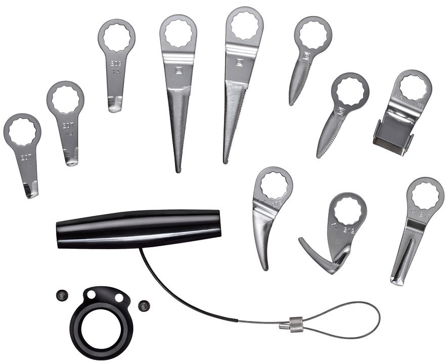 Coltelli di ricambio per il set professionale Cargo, composto da: 2 coltelli di forma diritta, dentati (forma 073), 1 coltello di forma diritta, con curvatura a Z, dentato (forma 081), 1 coltello a uncino, dentato (forma 217), 1 coltello di forma arcuata, con curvatura a Z (forma 072), 1 coltello a forma di L, dentato (forma 207 e 209), 1 raschietto a forma di paletta, con rivestimento antigraffio (forma 105) 1 cavo di trazione, 1 arresto di profondità