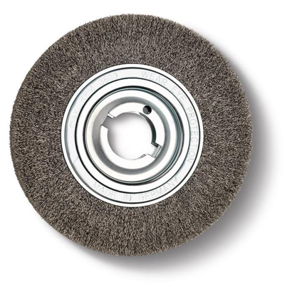 Ø 250 mm x 60 mm, con un'elevata capacità di asportazione per un impiego estremamente redditizio, foro di attacco Ø 51 mm. Fili metallici con uno spessore di 0,2 mm per tubi e profilati dalle pareti sottili. Fili metallici con uno spessore di 0,35 mm per l'impiego universale. Fili metallici con uno spessore di 0,5 mm per tubi e profilati a parete spessa e per una potenza di sbavatura elevata.