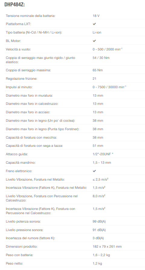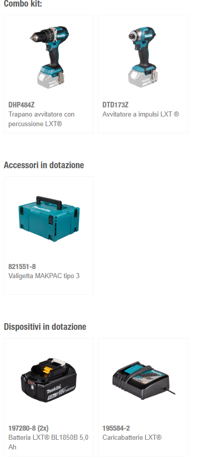 Un set completo di macchine a batteria 18V LXT® a due macchine che include DHP484 Trapano a percussione + DTD173 Avvitatore ad impulsi + 2 batterie 5Ah BL1850B + caricabatterie rapido 45' DC18RC + valigetta MAKPAC per riporre le macchine a fine lavori e per il trasporto.