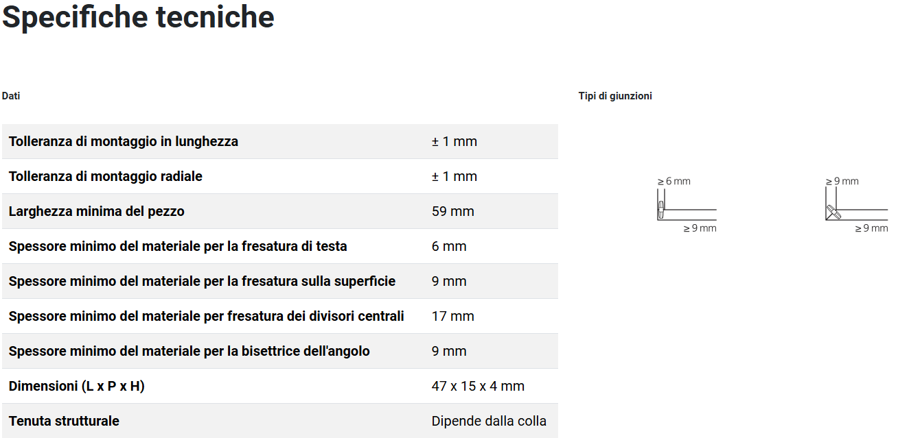 • Giunzioni angolari di pannelli con spessori a partire da 8 mm (lamella H9)