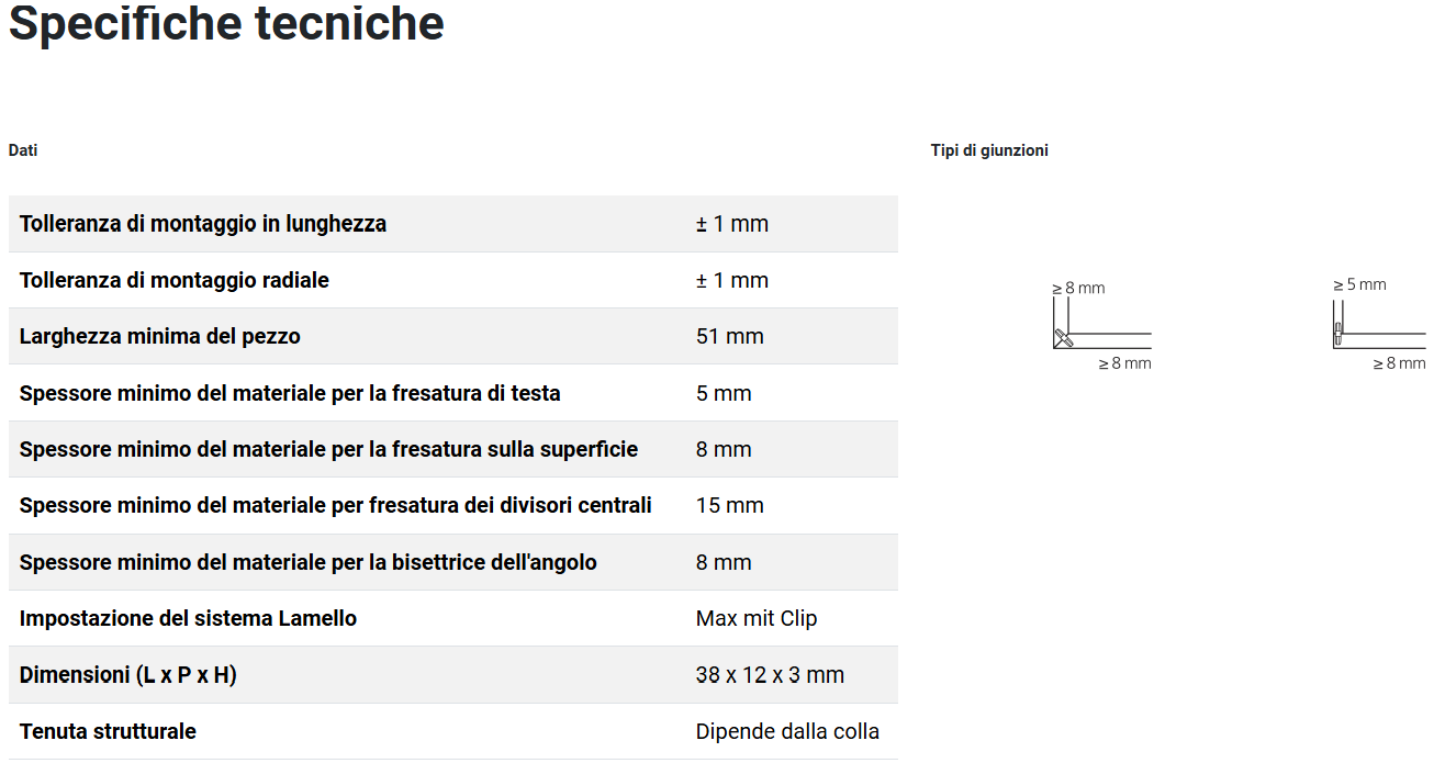 - Giunzioni angolari di pannelli con spessori a partire da 8 mm (lamella H9)