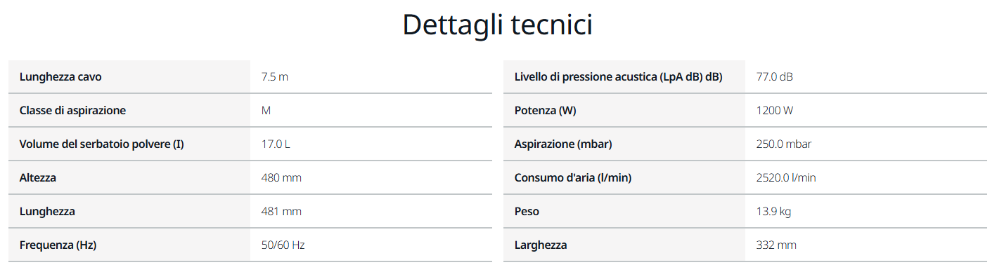 - serbatoio da 17 litri adatto all'uso sia a secco che a umido tramite un sacchetto della polvere che può essere sostituito o rimosso senza dover sganciare le cassette fissate sopra l'aspiratore