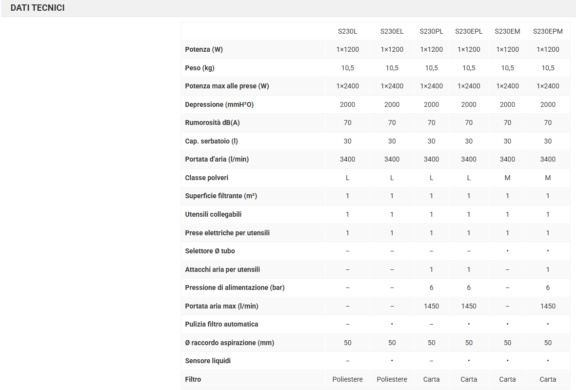 Tutti gli aspirapolvere, sia nella versione L che M, vengono forniti con un filtro realizzato con materiali certificati per l’aspirazione delle polveri di classe M.