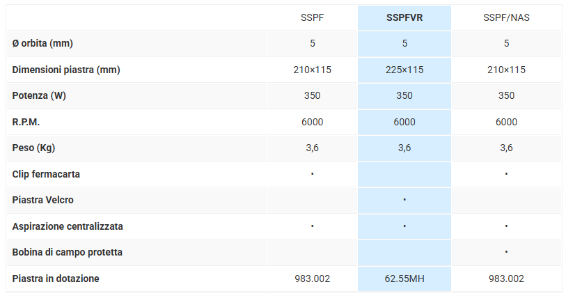 Storiche levigatrici RUPES, robuste ed affidabiliMotore con trasmissione ad ingranaggi per il corretto posizionamento del baricentro in asse con la piastra baseElevato indice di rendimento abrasivoSistema di raffreddamento ad alta efficienza con filtro antipolvereDotata di piastra gomma per abrasivo in rotoliPredisposte per la connessione a sistemi di aspirazione