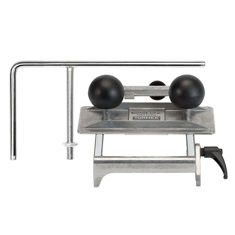Poiché l'affilatura viene eseguita sul lato posteriore piatto del coltello, questo dispositivo può lavorare tutti i tipi di profili con una larghezza massima di 100 mm. Il telaio comprende due strisce scorrevoli che riducono l'attrito e facilitano l'affilatura. Il contatto con la lama è ottimale e puoi sentire quando tocca la mola. Il dispositivo per coltelli per testine toupie SVP-80 consente anche di affilare al massimo i raschietti sagomati per sverniciare.