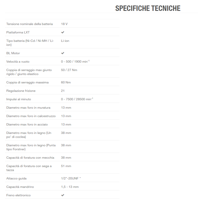 Trapano avvitatore a percussione 18V dotato di ingranaggi meccanici a 2 velocità: 0-500/0-1.900 g/min, la modalità ad alta velocità permette forature rapida per applicazioni leggere mentre la modalità a bassa velocità è studiata per applicazioni più pesanti che richiedono una coppia di serraggio elevata. Frizione con 21 impostazioni più modalità trapano per offrire la migliore regolazione in ogni situazione e freno elettrico per la massima produttività. La maggiore sicurezza dell'operatore è garantita dal sistema XPT che permette l'utilizzo in presenza di polvere e gocce d'acqua.