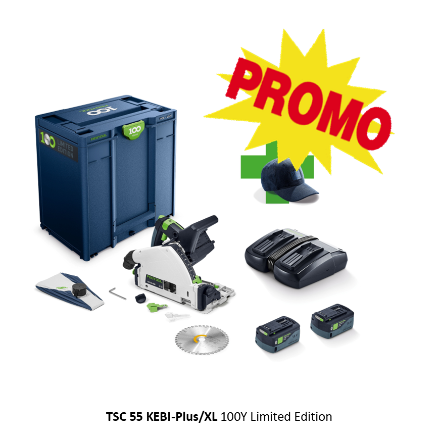 Questa versione speciale disponibile fino ad esaurimento scorte viene fornita con valigetta del centenario in colorazione blu e cappellino con visiera in omaggio, per festeggiare assieme ai professionisti i cento anni dalla fondazione del marchio Festool.