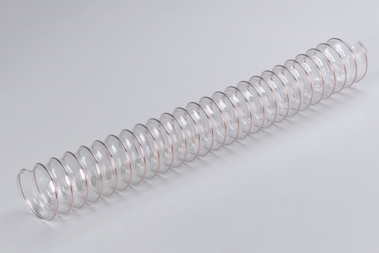 Tubo in TPU a base estere, rinforzato con spirale in acciaio ramato. Spessore da 0.35 mm a 0.50 mm. Ottima flessibilità e comprimibilità (circa 5:1) per un facile trasporto e stoccaggio.  Buona resistenza ad abrasione, flessione, olii minerali , invecchiamento, raggi UV, agenti atmosferici ed ozono.